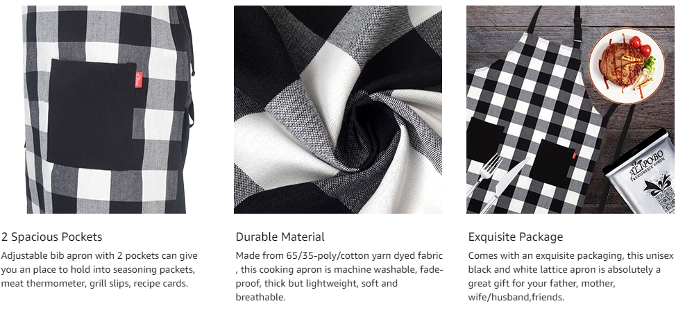 This black-and-white lattice apron with novel appearance will add a subtle elegance to your home kitchen. It must be a source of pride in front of your family or friends, and cause them to envy: WOW~ ALIPOBO professional chef apron, everyone loves it! The chef bib apron with 2 pockets presents you the most temperate and helpful cooking experience. 65/35-poly/cotton yarn dyed fabric makes it an ideal choice for home, grill, baking, cooking, craftsmen, chef, waiter, garden, artist, workshop, and mechanical use. Whether you are a devoted cook attracted by culinary expressions, a painter, barbecue host, or someone who needs security from certain aspects while cooking, or dealing with workshop equipment, this is the product to go for to keep your garment clean at all times.